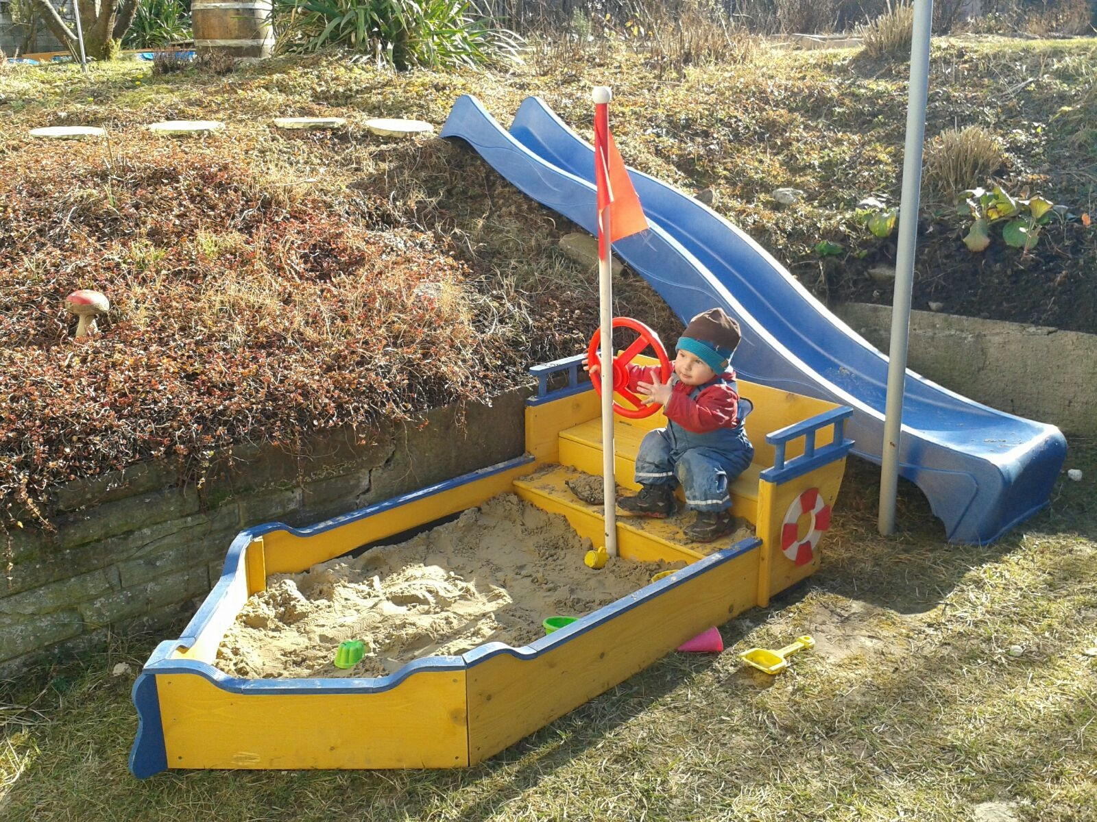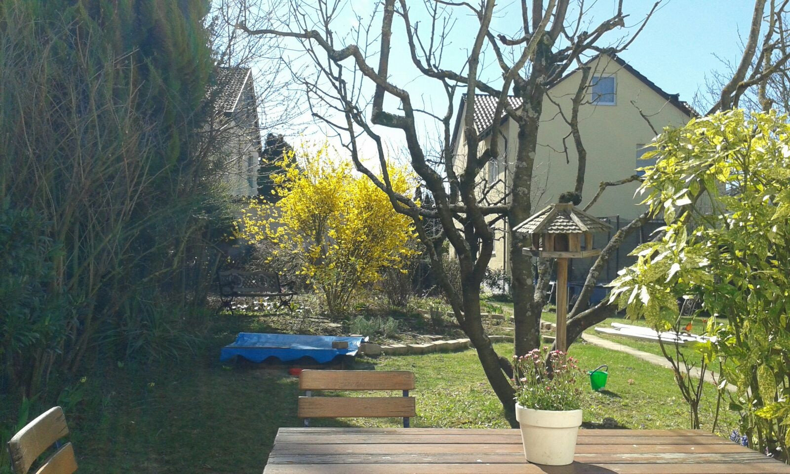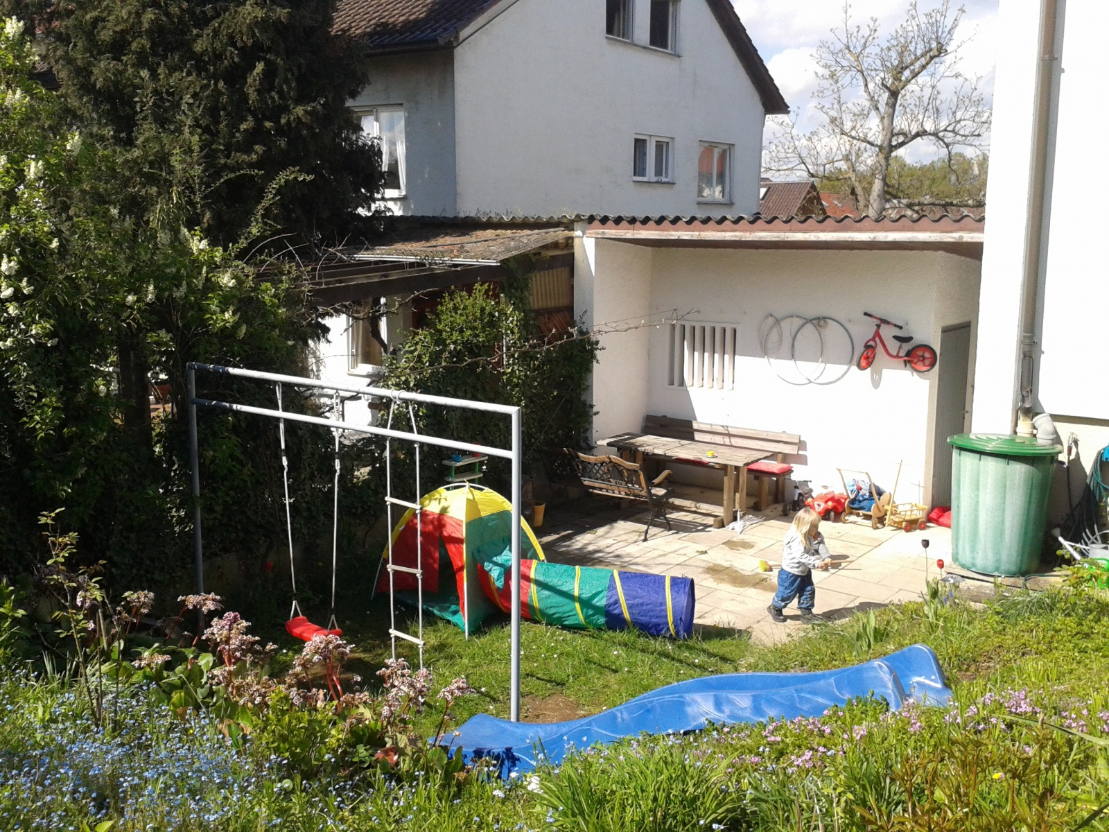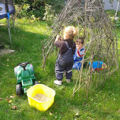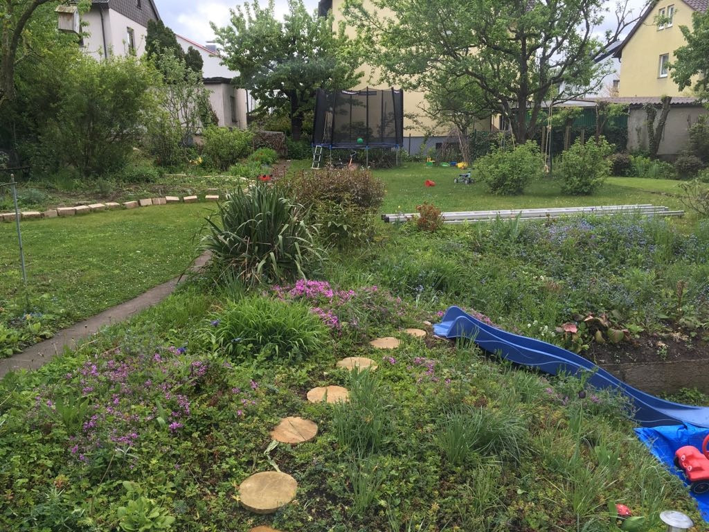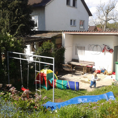 Blickt man in den Garten, können oft Vögel wie Kohl- und Blaumeisen, Grün- und Buntspechte oder Eichelhäher beobachtet werden. Bei etwas Glück kommt auch mal ein Eichhörnchen vorbei. Der sehr großzügige Garten bietet viel Platz zum Spielen und Toben. Es gib Schaukeln, eine Rutsche, zwei Sandkästen, Kinderfahrzeuge und vieles mehr. Einige Beete bieten die Möglichkeit zum Pflanzen, Ernten und Obst naschen... .
