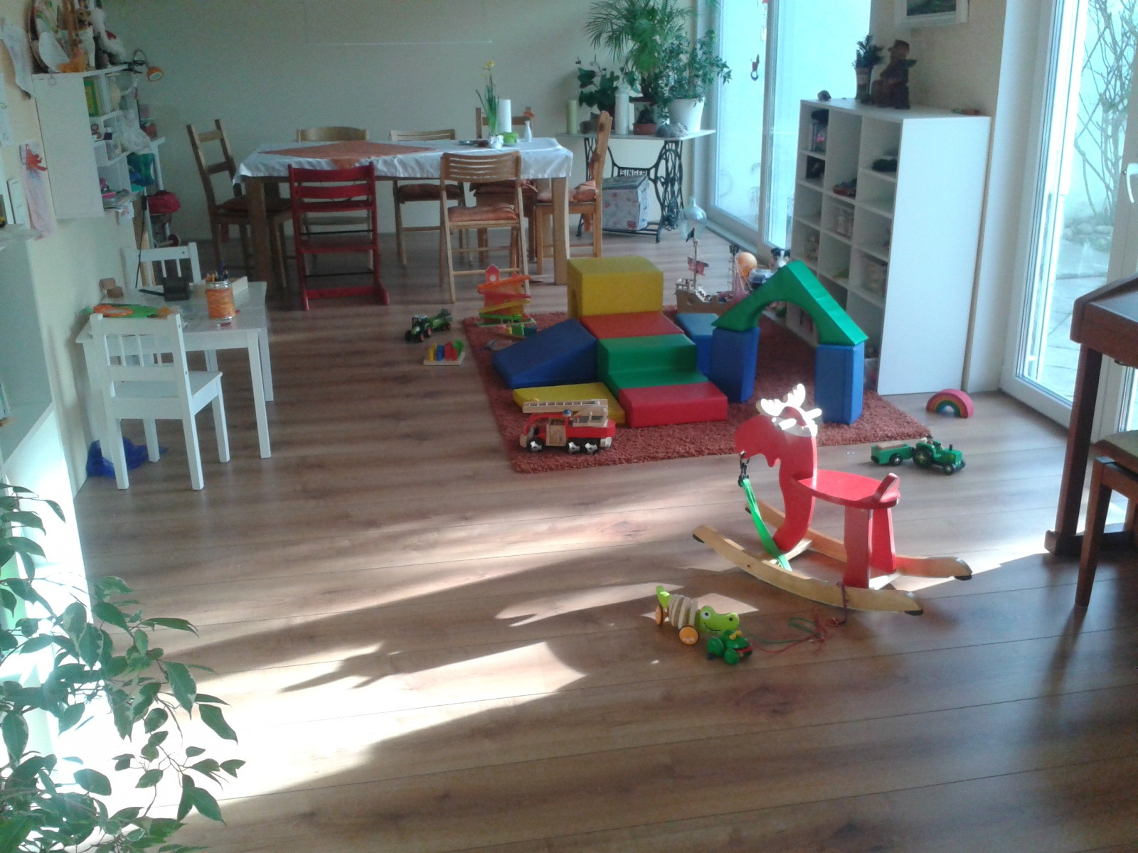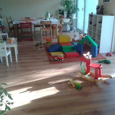 und Spielbereich sowie die Küche. Die bodentiefen Fenster und die Fußbodenheizung laden zum Spielen ein. Bei den Spielsachen achten wir auf Qualität. Wir setzen vor allem Holzspielzeug ein.